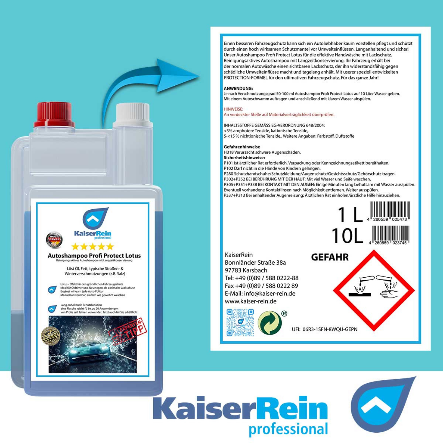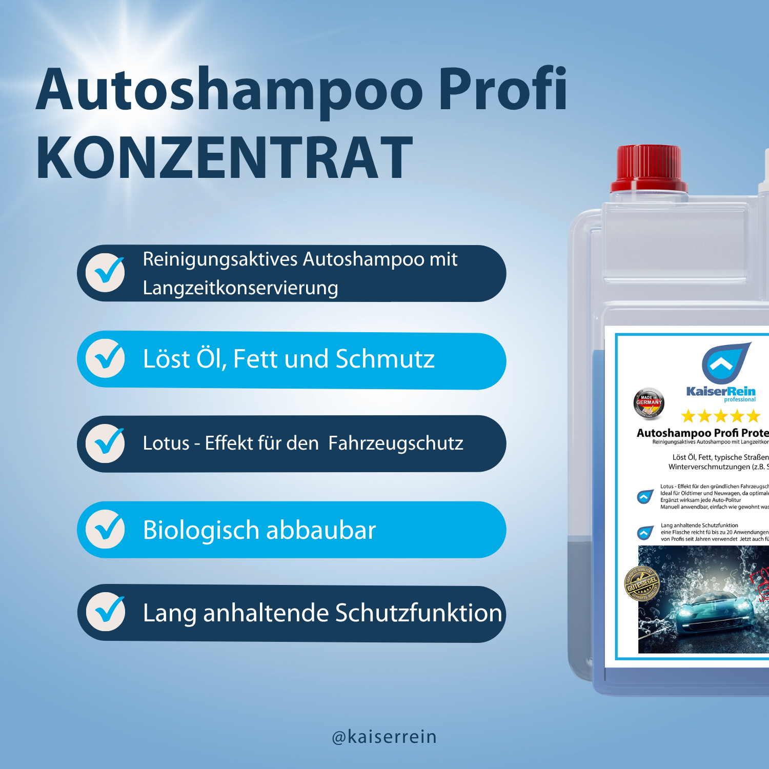 Einen besseren Fahrzeugschutz kann sich ein Autoliebhaber kaum vorstellen pflegt und schützt durch einen hoch wirksamen Schutzmantel vor Umwelteinflüssen. Langanhaltend und sicher! Unser Autoshampoo Profi Protect Lotus für die effektive Handwäsche mit Lackschutz. Reinigungsaktives Autoshampoo mit Langzeitkonservierung. Ihr Fahrzeug erhält bei der normalen Autowäsche einen sichtbaren Lackschutz, der ihn widerstandsfähig gegen schädliche Umwelteinflüsse macht und tagelang anhält. Mit userer speziell entwickelten PROTECTION-FORMEL für den ultimativen Fahrzeugschutz. Für das ganze Jahr!
