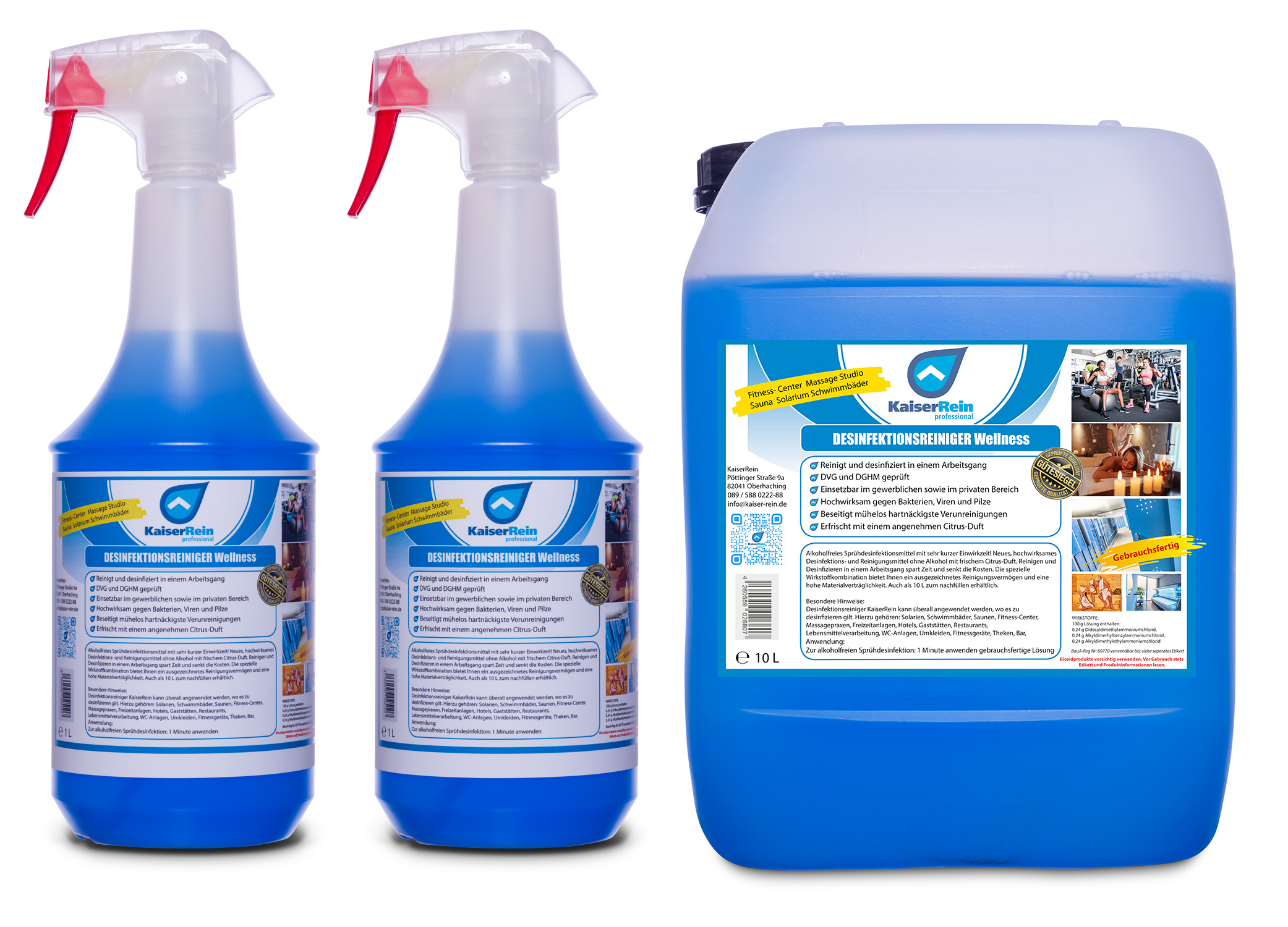 - Desinfektionsreiniger KaiserRein kann überall angewendet werden, wo es zu desinfizieren gilt. Hierzu gehören: Sonnenstudios, Schwimmbäder, Saunen, Fitness-Center, Massagepraxen, Freizeitanlagen, Hotels, Gaststätten, Restaurants, Fitnesstudios, WC-Anlagen, Umkleiden, Fitnessgeräte, Theken, Bar, Isomatten