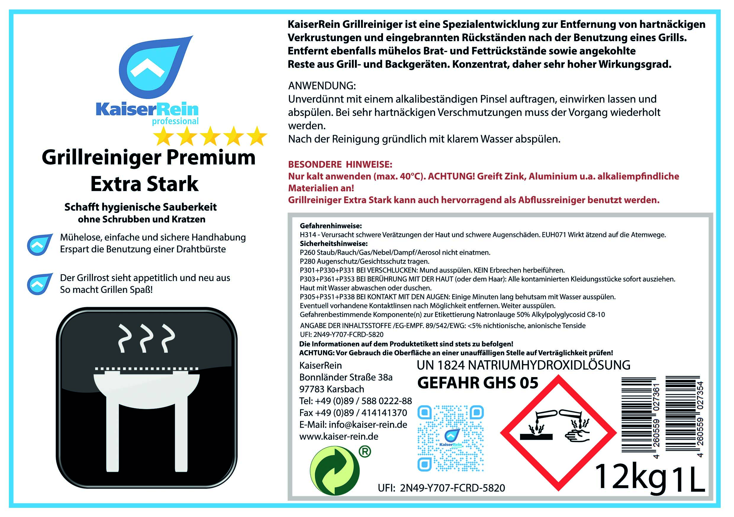 Beschreibung: Löst und entfernt schnell und sicher Fett, verharzte Öle und Verbrennungsrückstände sowie nahezu alle hartnäckigen Verkrustungen von alkalibeständigen Oberflächen. Hinterlässt saubere, fettfreie und hygienisch reine Oberflächen ohne zu Scheuern. Zur Reinigung von Backöfen, Grillgeräten, Fritteusen, Dunstabzugshauben, Rosten, Backblechen (Stahl) und Räucherkammern. Anzuwenden auf kalten Oberflächen. Das Produkt ist aufgrund der Zusammensetzung und bei sach- u. fachgerechter Verwendung als Reinigungsmittel für den Gebrauch im Bereich der Lebensmittelverarbeitung geeignet. löst hartnäckige Verkrustungen höchste Fettlösekraft warm und kalt verwendbar Anwendung: Löst und entfernt schnell und sicher Fett, verharzte Öle und Verbrennungsrückstände sowie nahezu alle hartnäckigen Verkrustun gen von Wasser-, lösungsmittel- und alkalibeständigen Oberflächen. Hinterlässt saubere, fettfreie und hygienisch reine Flächen ohne zu Scheuem. Anzuwenden sowohl auf kalten und als auch auf warmen Oberflächen. KaiserRein Grillreiniger ist eine Spezialentwicklung zur Entfernung von hartnäckigen Verkrustungen und eingebrannten Rückständen nach der Benutzung eines Grills. Entfernt ebenfalls mühelos Brat- und Fettrückstände sowie angekohlte Reste aus Grill- und Backgeräten. Konzentrat, daher sehr hoher Wirkungsgrad. ANWENDUNG: Unverdünnt mit einem alkalibeständigen Pinsel auftragen, einwirken lassen und abspülen. Bei sehr hartnäckigen Verschmutzungen muss der Vorgang wiederholt werden. Nach der Reinigung gründlich mit klarem Wasser abspülen. BESONDERE HINWEISE: Nur kalt anwenden (max. 40°C). ACHTUNG! Greift Zink, Aluminium u.a. alkaliempfindliche Materialien an! Grillreiniger Extra Stark kann auch hervorragend als Abflussreiniger benutzt werden.