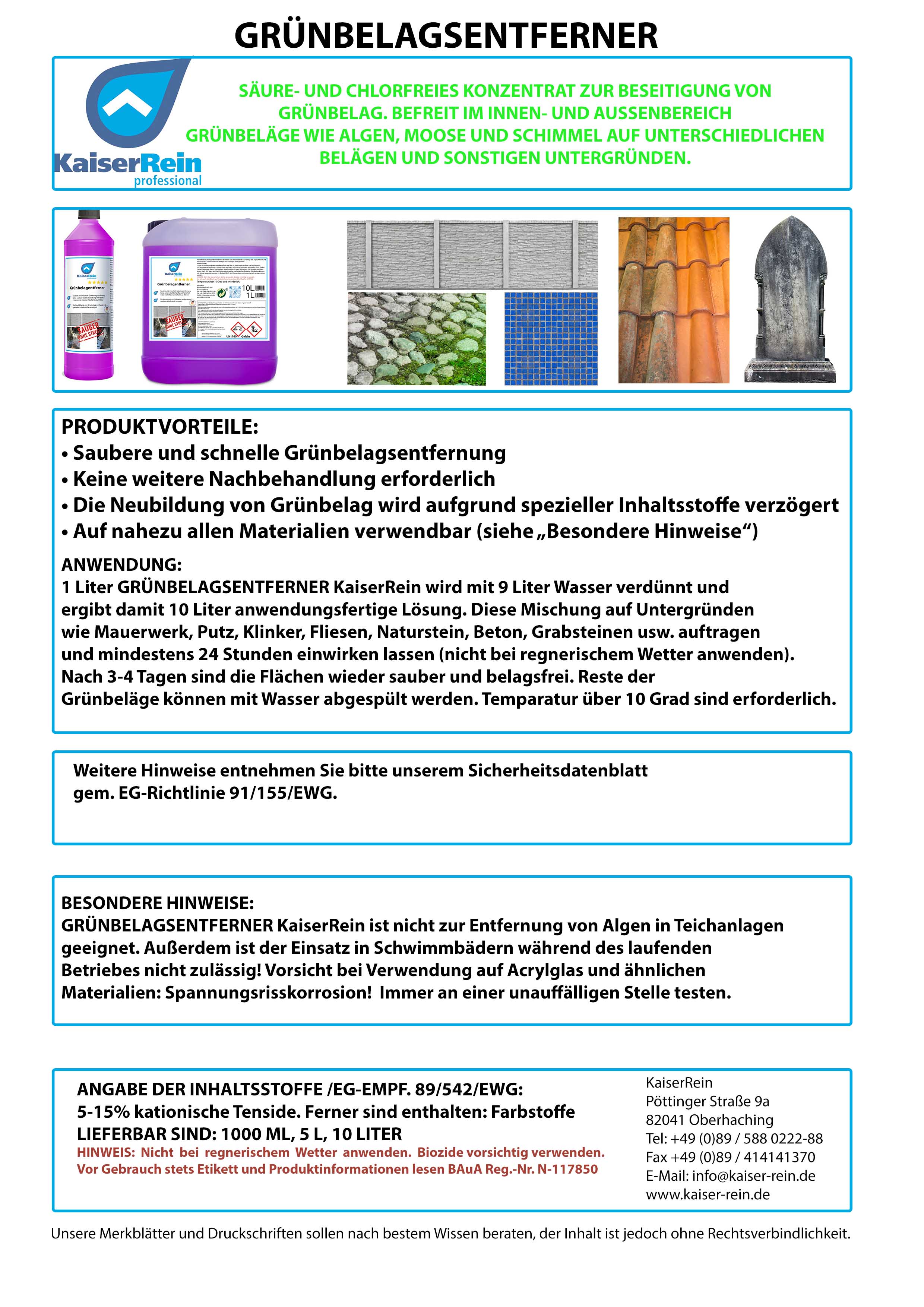1 Liter Grünbelagsentferner von KaiserRein wird mit 9 Liter Wasser verdünnt und ergibt damit 10 Liter anwendungsfertige Lösung. Diese Mischung auf Untergründen wie Mauerwerk, Putz, Klinker, Fliesen, Naturstein, Beton, Grabsteinen, Metalle usw. auftragen, Mindestens 24 Stunden einwirken lassen. Nach 3-4 Tagen sind die Flächen wieder sauber und belagsfrei. Reste der Grünbeläge können mit Wasser abgespült werden.