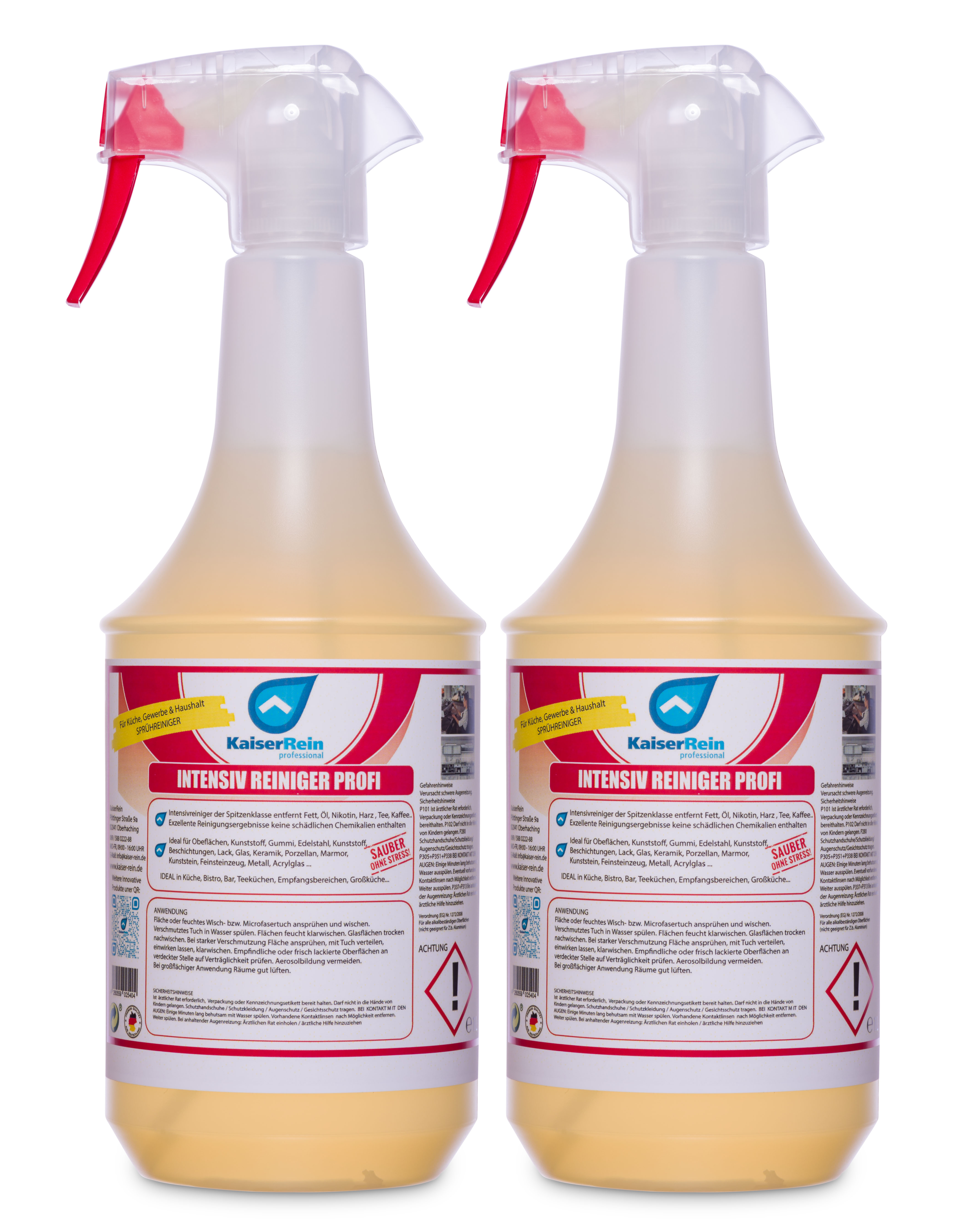 KaiserReiun Intensivreiniger Profi ist ein Oberflächenreiniger der Spitzenklasse für wasserfeste Möbel, Wände, Böden, Türen, Maschinen, Fahrzeuge und anderen technischen Einrichtungen. Kraftvoller Sprühreiniger mit ausgeprägtem Lösevermögen für alle Verschmutzungen z,B. Fett, Öl, Nikotin, Harz, Tee, Kaffee... Er ist für den Härte Einsatz in Gastronomie, Gastro, Haushalt, Industrie und vieles mehr. Er überzeugt durch seine enorme Leistungskraft auf auf allen Flächen ganz besonders auf Edelstahl und Kunststofflächen.