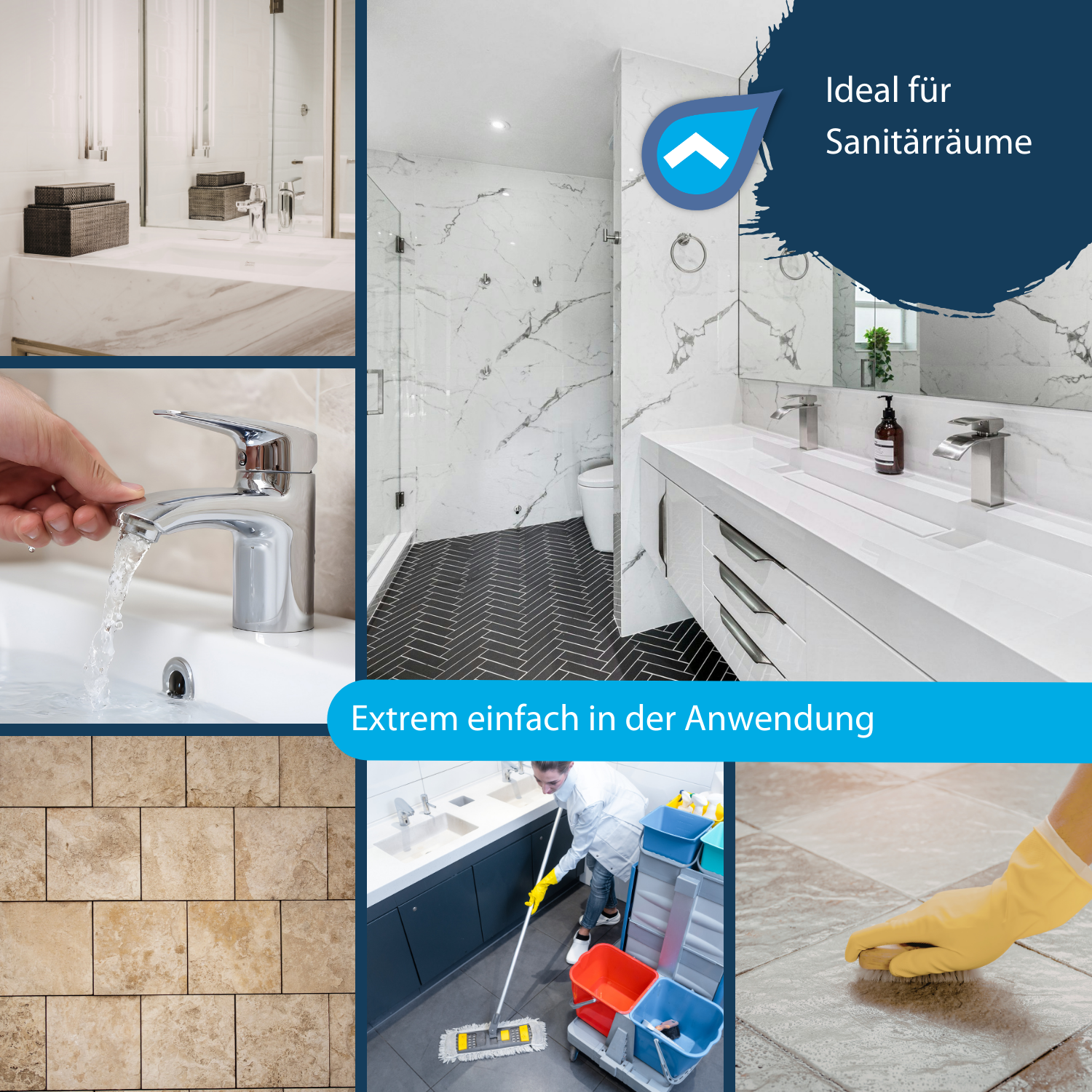 Hochwirksamer, pH‑neutraler Sanitärreiniger für den gesamten Nassraumbereich. Reinigt zuverlässig Sanitärräume, Bäder, Duschen, Schwimmbäder und Umkleiden. Entfernt mühelos Schmutz, Kalk- und Seifenrückstände und ist dabei besonders materialschonend. Geeignet für die tägliche Unterhaltsreinigung.