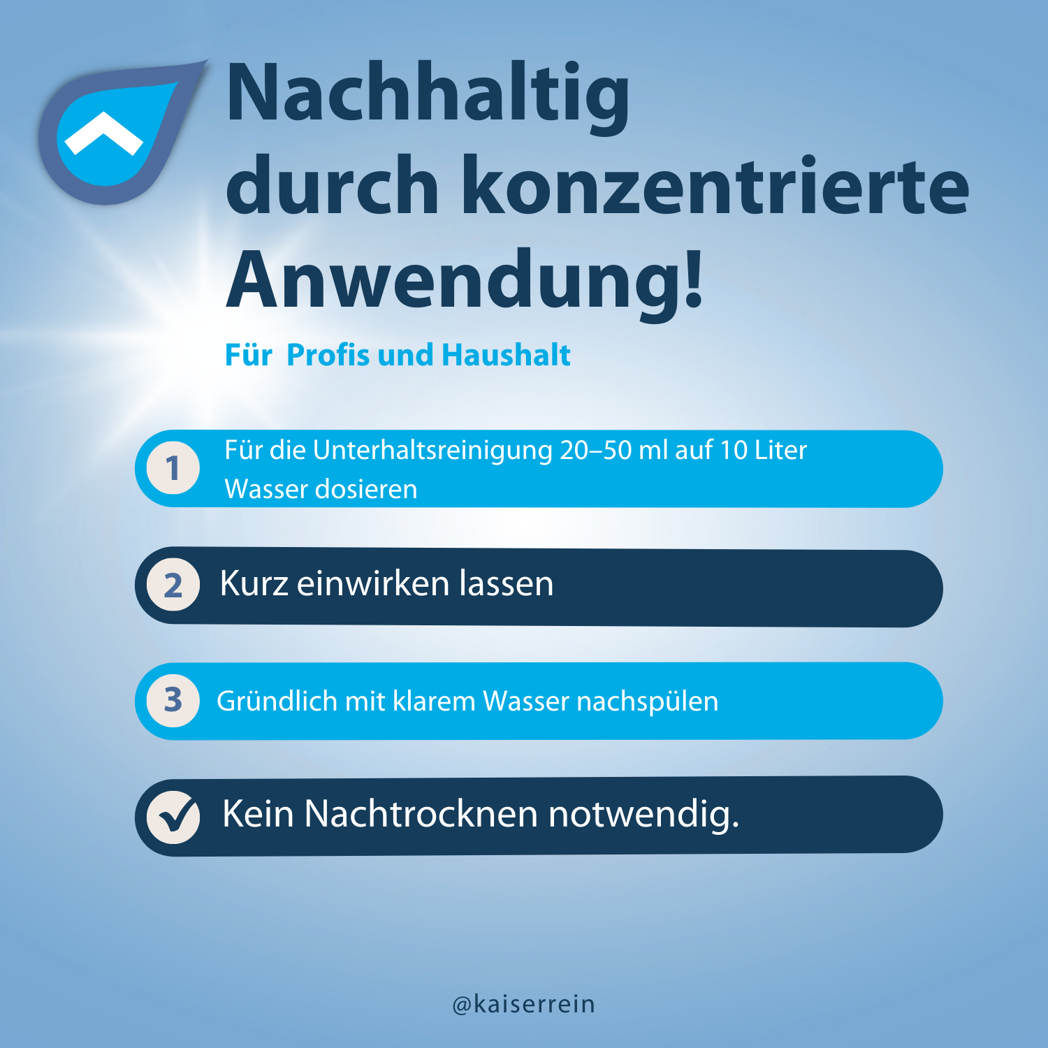 Für die Unterhaltsreinigung 20–50 ml auf 10 Liter Wasser dosieren. Bei stärkerer Verschmutzung entsprechend höher dosieren. Nach kurzer Einwirkzeit gründlich mit klarem Wasser nachspülen. Vor der Anwendung Materialverträglichkeit an unauffälliger Stelle prüfen