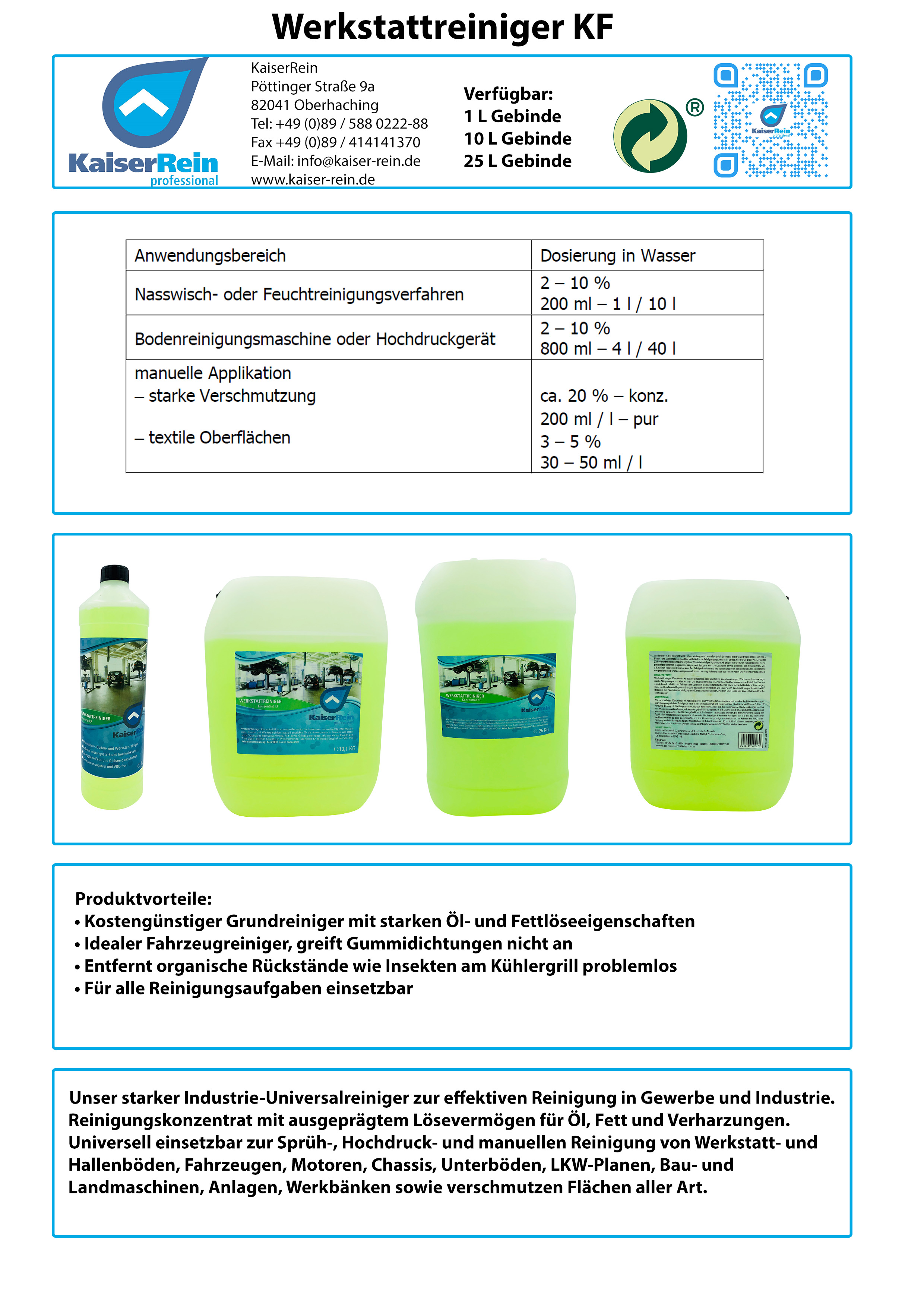 Maschinen- und Werkstattreiniger KF zeichnet sich durch hervorragende Reinigungs-eigenschaften gegenüber öligen und fettigen Verschmutzungen sowie anderen Schmutzregimen, wie z.B. nativen Harzen und Stärke, aus. Der Reiniger besitzt aufgrund seiner speziellen Tenside und Sequestriermittel ausgezeichnete Benetzungseigenschaften und vermag Schmutz auch aus feinen Poren und Ritzen herauszulösen.
